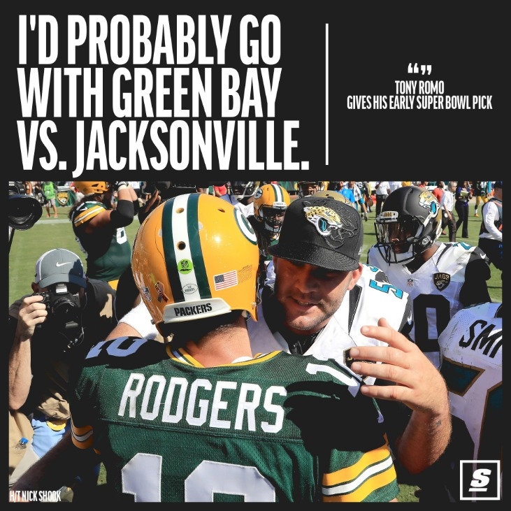 โทนี่ โรโม่ ผู้บรรยายเกมอเมริกันฟุตบอลของสถานีโทรทัศน์ ซีบีเอส ฟันธงแบบไม่กลัวหน้าแตกตั้งแต่ เอ็นเอฟแอล ฤดูกาลใหม่ยังไม่เริ่มว่า คู่ชิงแชมป์ซูเปอร์ โบวล์ ครั้งที่ 53 จะเป็นการพบกันของ แจ็คสันวิลล์ จากัวร์ส กับ กรีน เบย์ แพ็คเกอร์ส