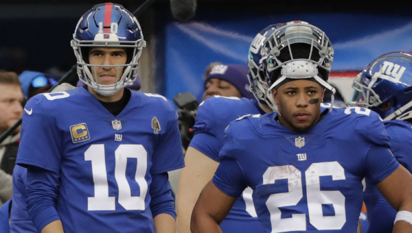 ซาควอน บาร์คลี่ย์ (ขวา) รันนิ่งแบ็กดาวรุ่งของ นิวยอร์ค ไจแอนท์ส โต้ตอบเสียงวิพากษ์วิจารณ์ที่มีต่อรุ่นพี่ อีลาย แมนนิ่ง (ซ้าย) ควอร์เตอร์แบ็กวัย 38 ปีที่ทำผลงานไม่ดีในช่วงหลัง