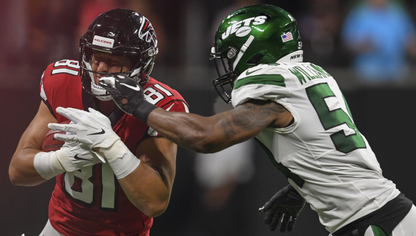 เอฟเวอรี่ย์ วิลเลียมสัน (ขวา) ไลน์แบ็กเกอร์ นิวยอร์ค เจ็ตส์ กำลังไล่ล่าแท็คเกิ้ล ออสติน ฮูเปอร์ ปีกใน แอตแลนต้า ฟอลค่อนส์ ก่อน วิลเลียมสัน จะบาดเจ็บเข่าจนต้องปิดเทอมยาวทั้งซีซั่น