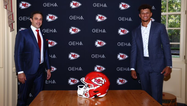 คล้าร์ก ฮันท์ ประธานทีมและซีอีโอของ แคนซัส ซิตี้ ชีฟส์ กับ แพทริค มาโฮมส์ ควอร์เตอร์แบ็กวัย 24 ปีในการแถลงข่าวการทำข้อตกลง 10 ปี มูลค่า 450 ล้านเหรียญสหรัฐกับทีมหัวหน้าเผ่า